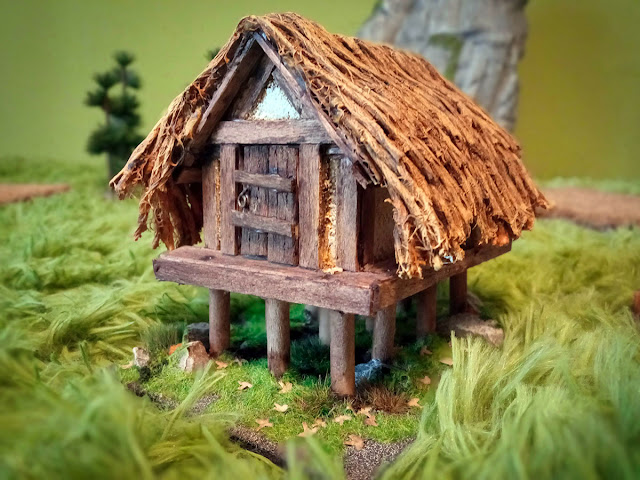 El estilo rústico de ambos edificios me permitió trabajar de forma tosca y experimental. Los dos están hechos casi en su totalidad con materiales reciclados. Entre los productos comprados están unos palitos de madera estrechos que podéis ver en el "encofrado Tudor" y palos de manualidades para los pilares del hórreo, además de cuerda de esparto (techados) y goma EVA (para la chimenea de piedra).